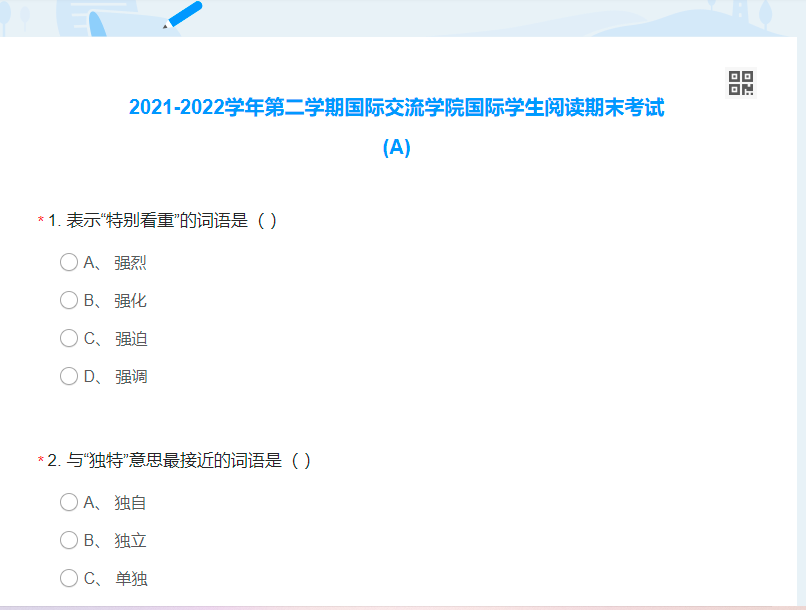 6月21日,beat365本学期期末考试进入第二天。当日beat365共开设7门课程的考试,均顺利开考。考试平台包括腾讯会议、问卷星、微信视频会议等。考试形式包括视频连线、在线提交、电子试卷等。总体时间安排合理,教师监考方式整体有效,链接公布及时,巡考全覆盖。个别学生在线考试时未打开视频。