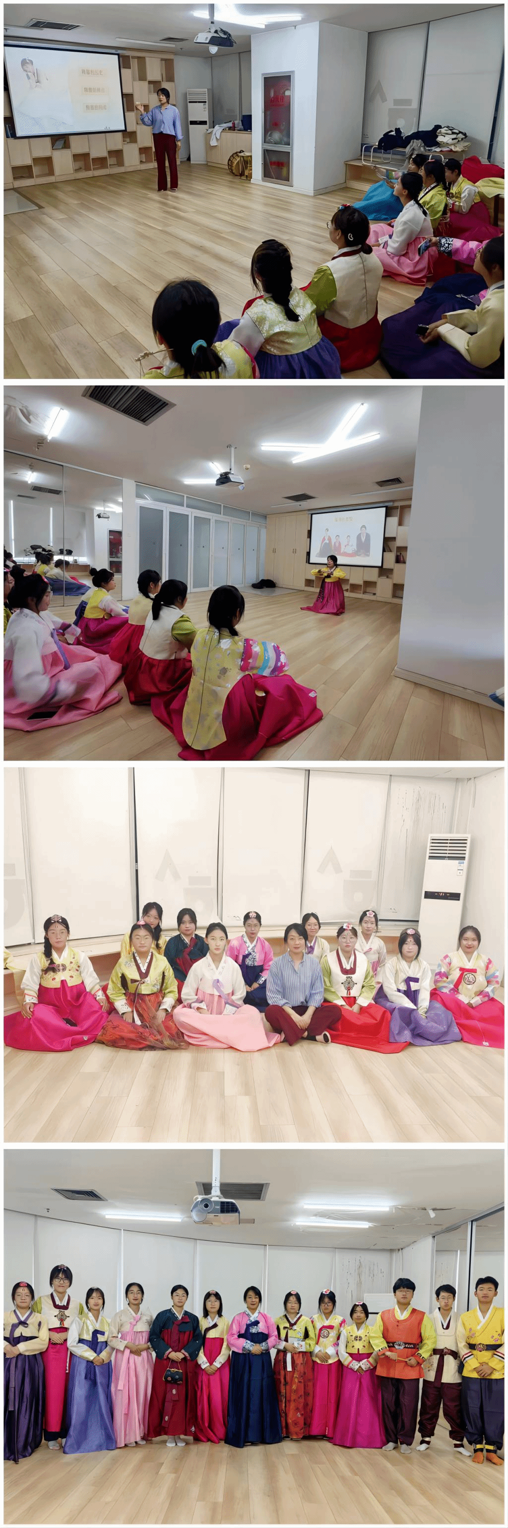 活动分两部分进行。在韩服讲解环节中,马文黎老师首先向学生们介绍了韩服的历史和特点,详细讲解了韩服的穿着技巧、着装场合和注意事项等,最后还演示了行大礼的方式。