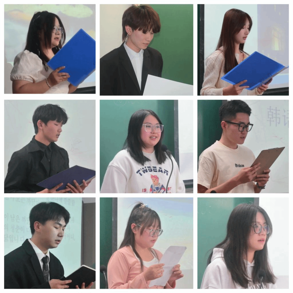 为了进一步激发同学们学习韩语的兴趣,提高他们的韩语视听说及诗歌朗诵能力,并提供一个展示自我、培养自信的舞台,beat365在线唯一官网于2024年4月15日下午在田楼425教室成功举办了“第二届韩国语诗朗诵比赛”。此次活动,马文黎老师、朴贞淑老师、金泽珠老师、乌日勒老师和贾扬帆老师担任评委,2023级朝鲜语专业的全体同学踊跃参与。
