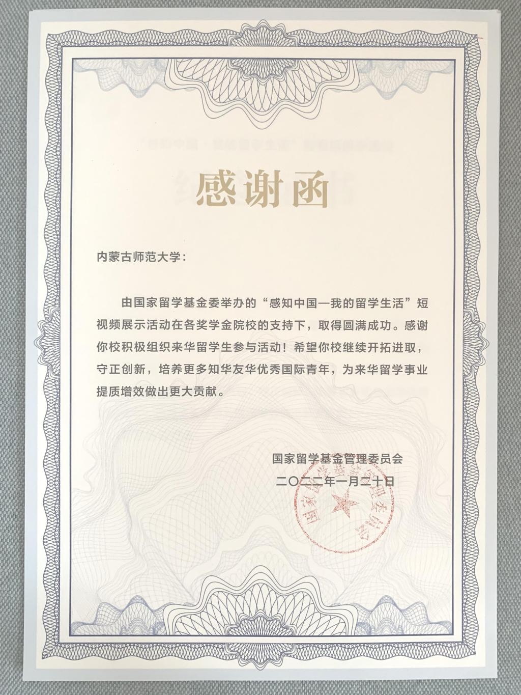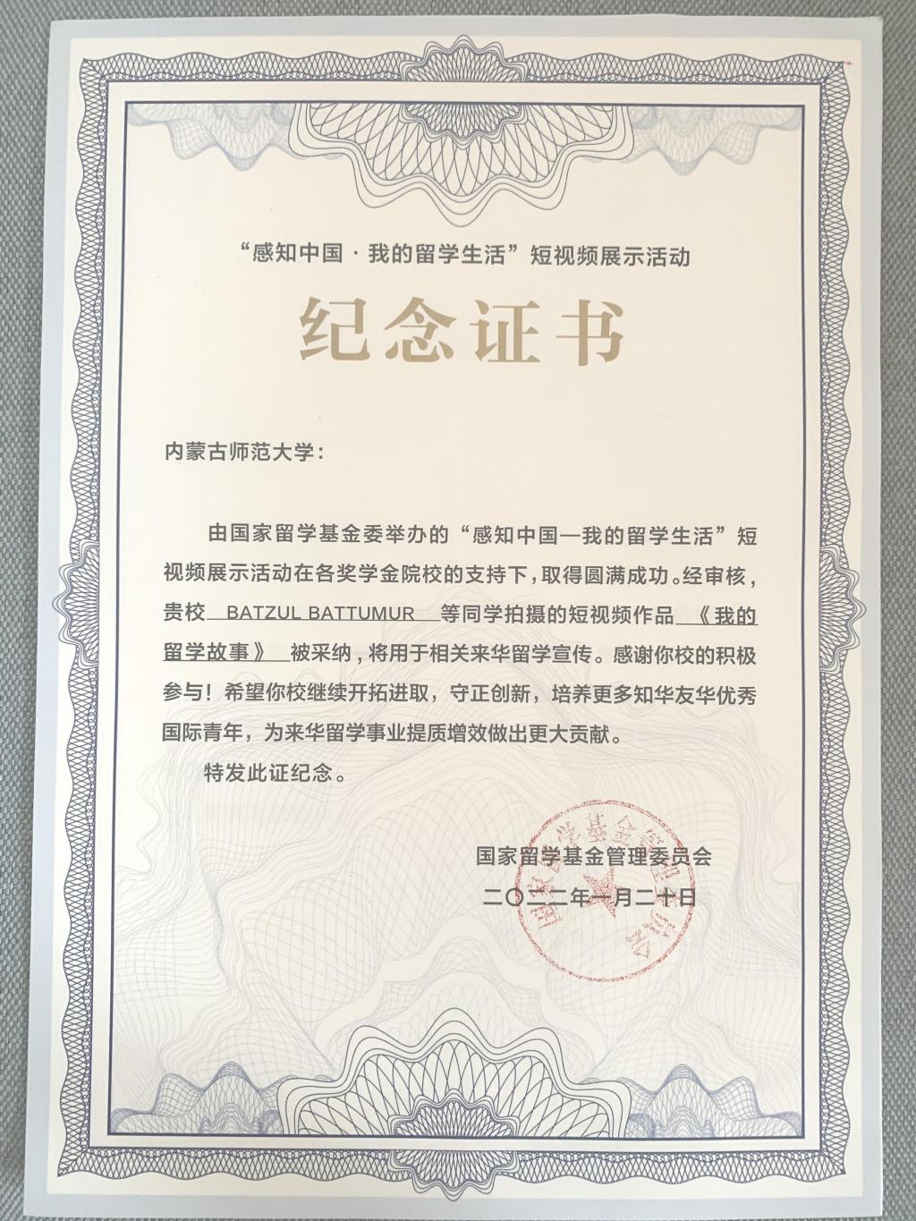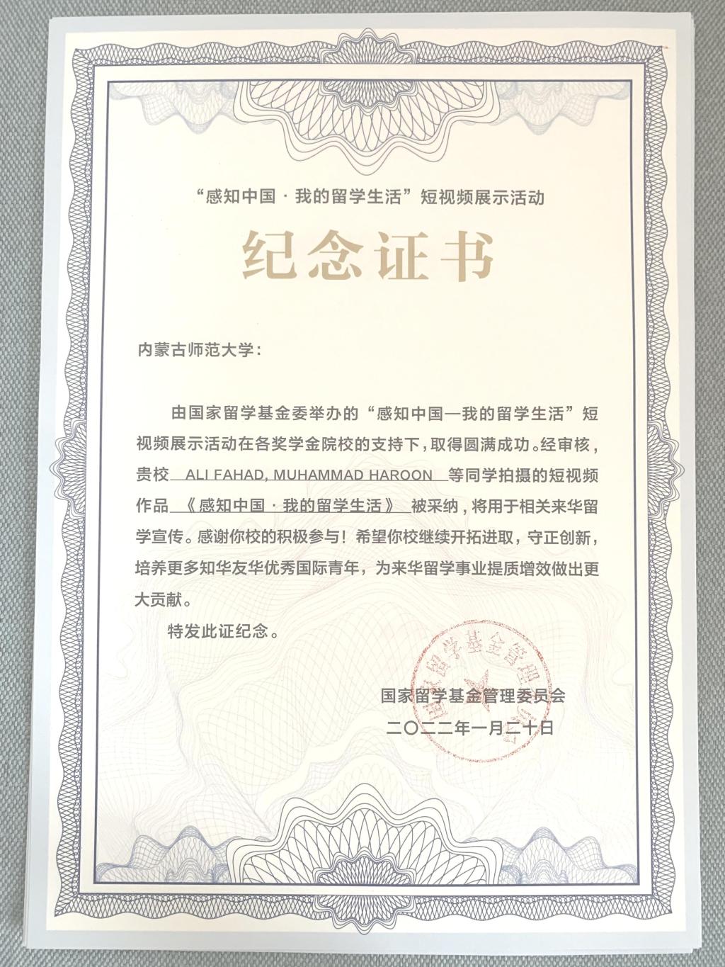 近日,国家留学基金管理委员会举办的“感知中国—我的留学生活”短视频展示活动结果公布。beat365beat365在线唯一官网选送的巴基斯坦籍中国政府奖学金生浩然(ALI FAHAD)、浩宁(HAROON MUHAMMAD )的《感知中国—我的留学生活》和蒙古籍中国政府奖学金生巴图珠拉(BATTUMUR BATZUL)的《我的留学故事》等两部作品获得纪念证书,学校同时收到国家留学基金管理委员会感谢函。