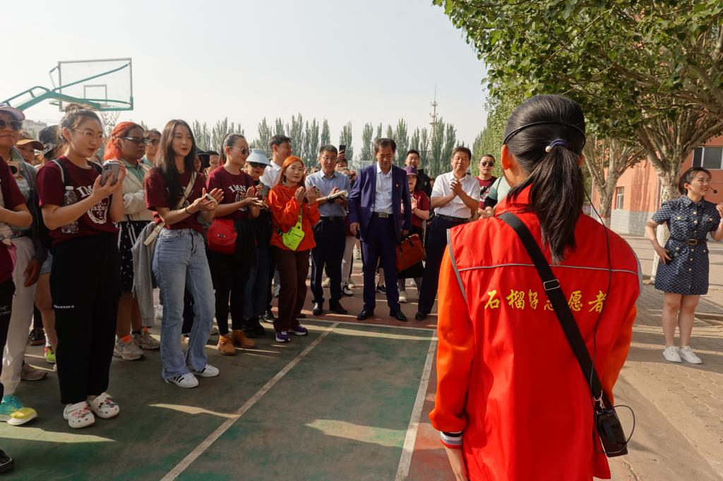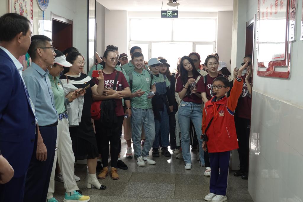 接下来,我们来到了乌海市海南区第一小学。海南区第一小学创办于1978年,隶属于海南区教育局,是海南区唯一的一所自治区实验学校。海南区第一小学充分弘扬“蒙古马精神”,把吃苦耐劳、一往无前、不达目的决不罢休的精神融入到育人文化中,前后培养出杨佳玉、张尧、鲁宁、焦双双等世界冠军和全国冠军。第一小学讲解团的小朋友们热烈欢迎我们,并怀着激情,以接力的形式轮流介绍了学校发展情况和特色校园活动。在学生礼堂我们参观了主题为“唱响民族团结主旋律 共建民族和谐新校园”的民族团结创建工作成果。其中学生们“石榴花开心向党”、“石榴花开籽相连征文”、“传递书香共成长读书节活动”等系列书法、征文、图画、手工等作品吸引了留学生们的眼球。